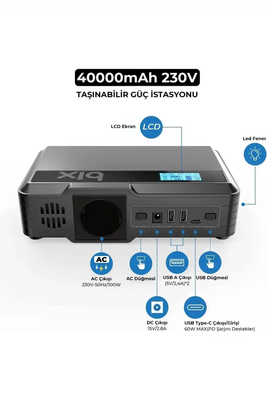 230v 100w Inverter Powerbank 2*usb 1*type-c Pd Çıkışlı Led Işıklı Şarj Istasyonu